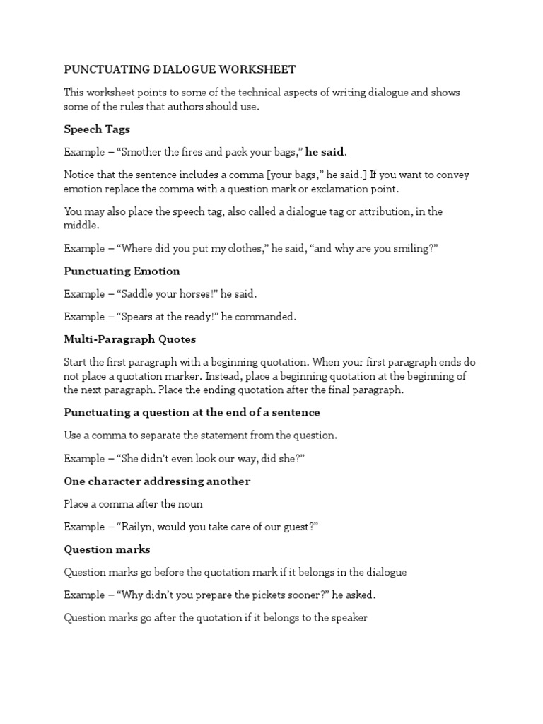 Dialogue is one of my favorite things to write, and i wish that my job as a technical writer offered more (or however, some writers find punctuating dialogue confusing: Punctuating dialogue worksheet (page 1) punctuate dialogue with comic strips, candy hearts, & more punctuating dialogue worksheet third grade 1000 images about grammar quotations on. These worksheets provide additional practice in punctuating dialogue. Punctuation goes inside quotations marks. Punctuating dialogue and direct quotations.